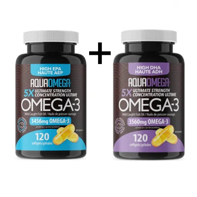 Pairing of 1 bottle AquaOmega High EPA + 1 bottle AquaOmega High DHA. Designed to be taken as 1 softgel of each daily